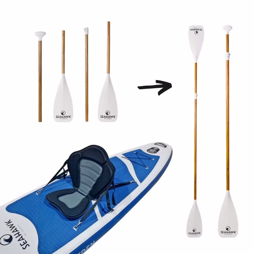 Uppgradera din paddelupplevelse med en bekväm kajaksits och en 4-delad kajakpaddel. Perfekt för paddlare som vill växla mellan SUP och kajakpaddling utan att kompromissa med komfort eller prestanda.