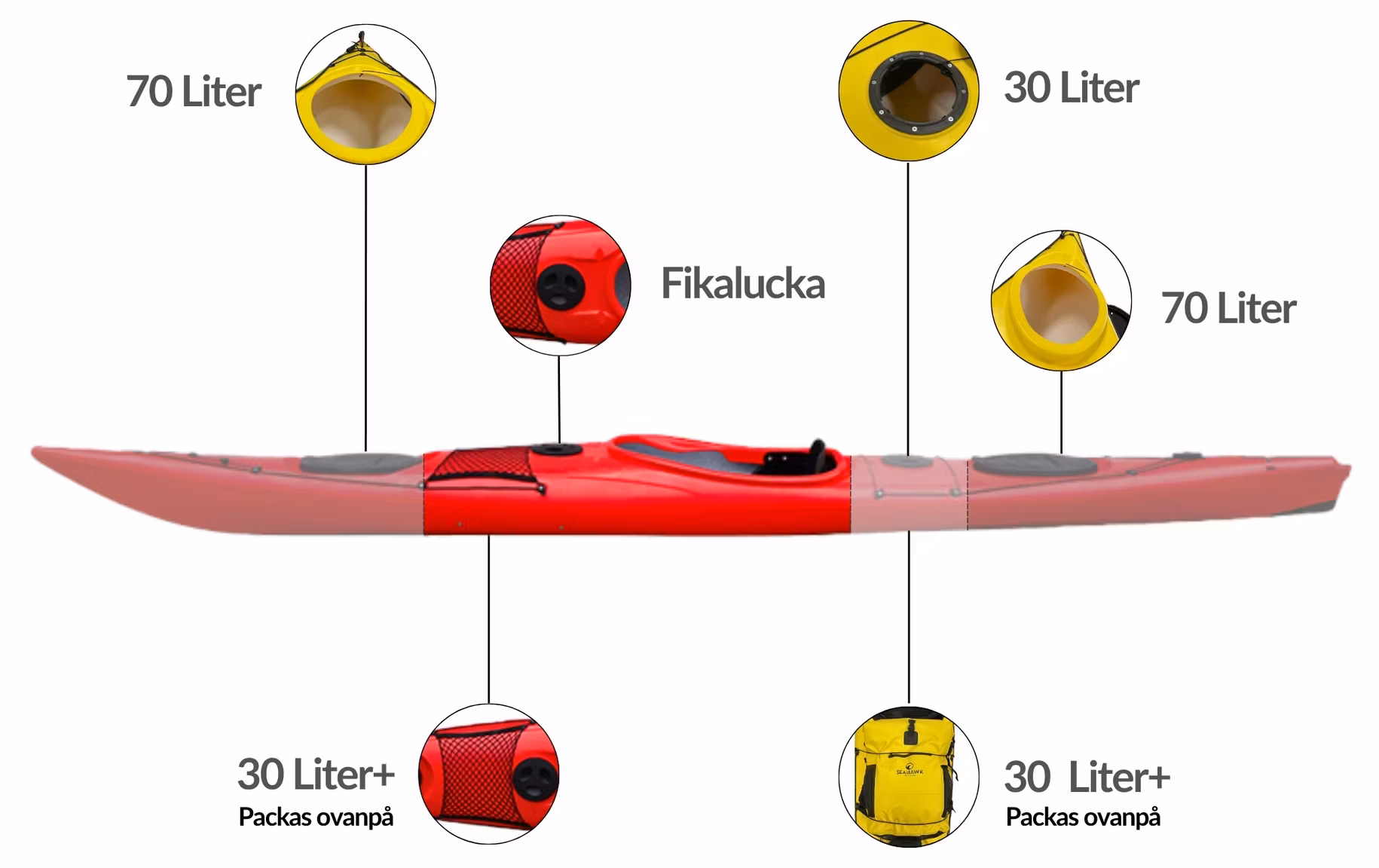 Kajaken har generösa förvaringsutrymmen, inklusive två stora packutrymmen och två mindre, där du enkelt kan stuva dina campingutrustning, mat, och andra nödvändigheter för längre turer. Dessutom kan du använda däcklinorna och drybags för att säkert fästa ytterligare utrustning på utsidan.