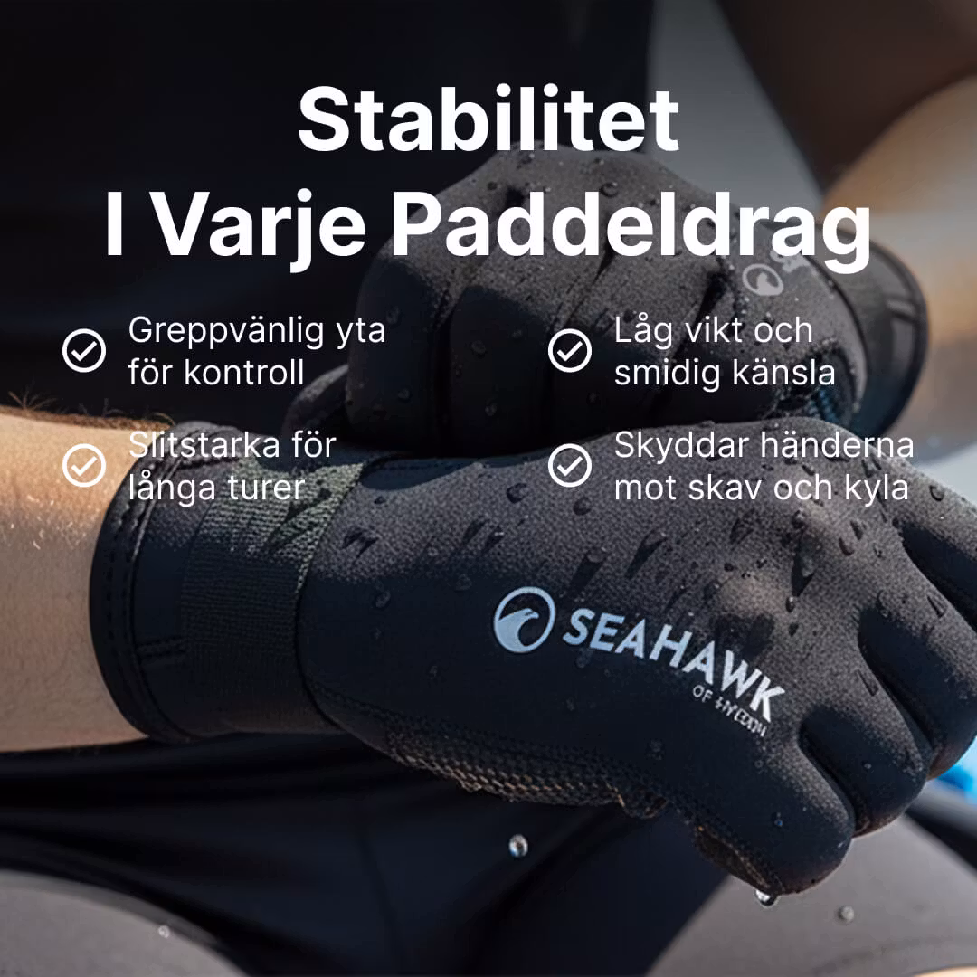 Neoprenhandskarna från Seahawk Of Sweden är tillverkade bekvämt, mjukt och stretchigt material som formar sig efter just dina händer. Handskarna passar utmärkt när du ska paddla kajak, surf ski, SUP och all annan vattensport! Materialet gör även att du får ett välsittande grepp runt paddeln vilket motverkar blåsor, håller dig varm och torr när du är ute på din paddeltur.